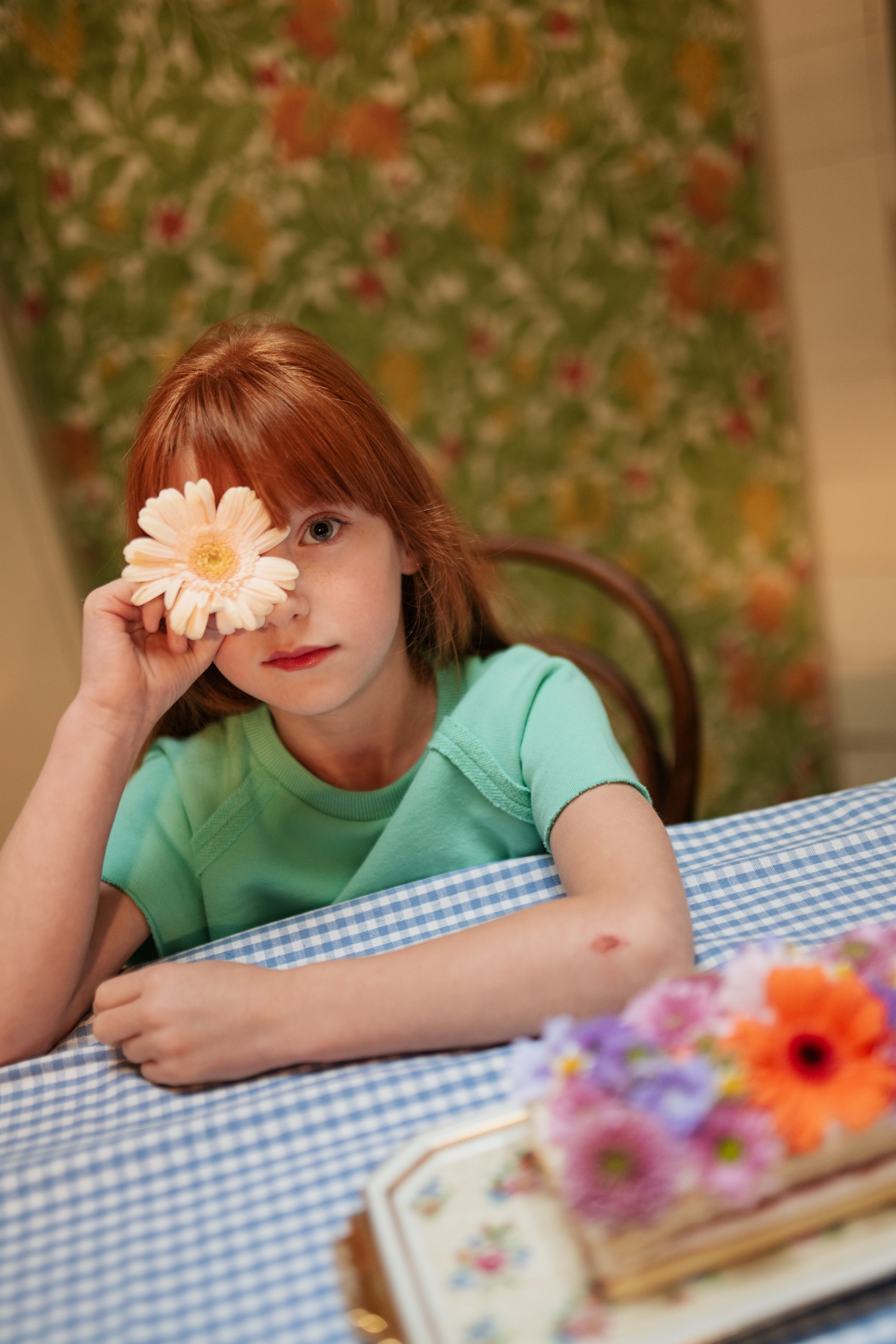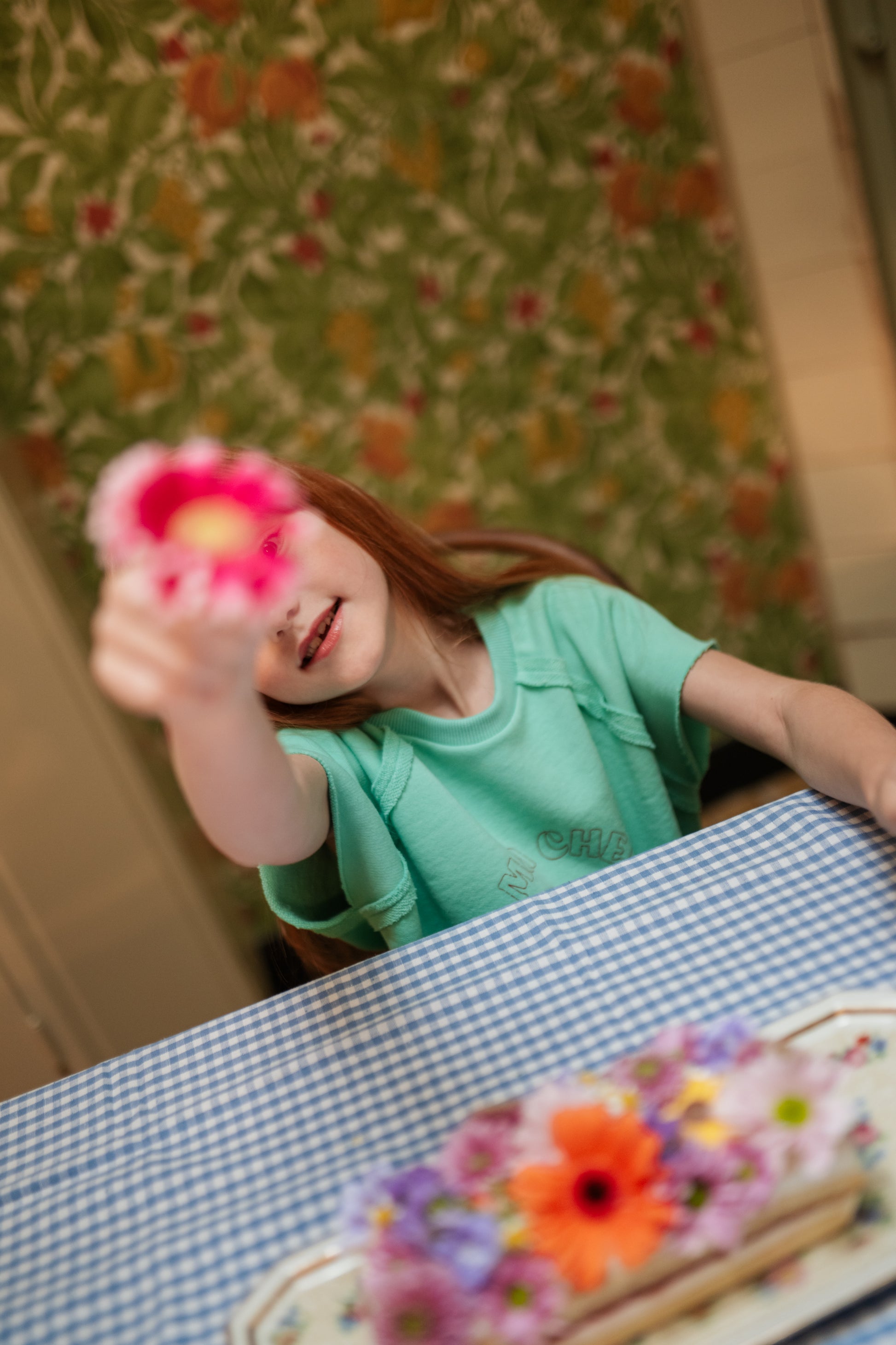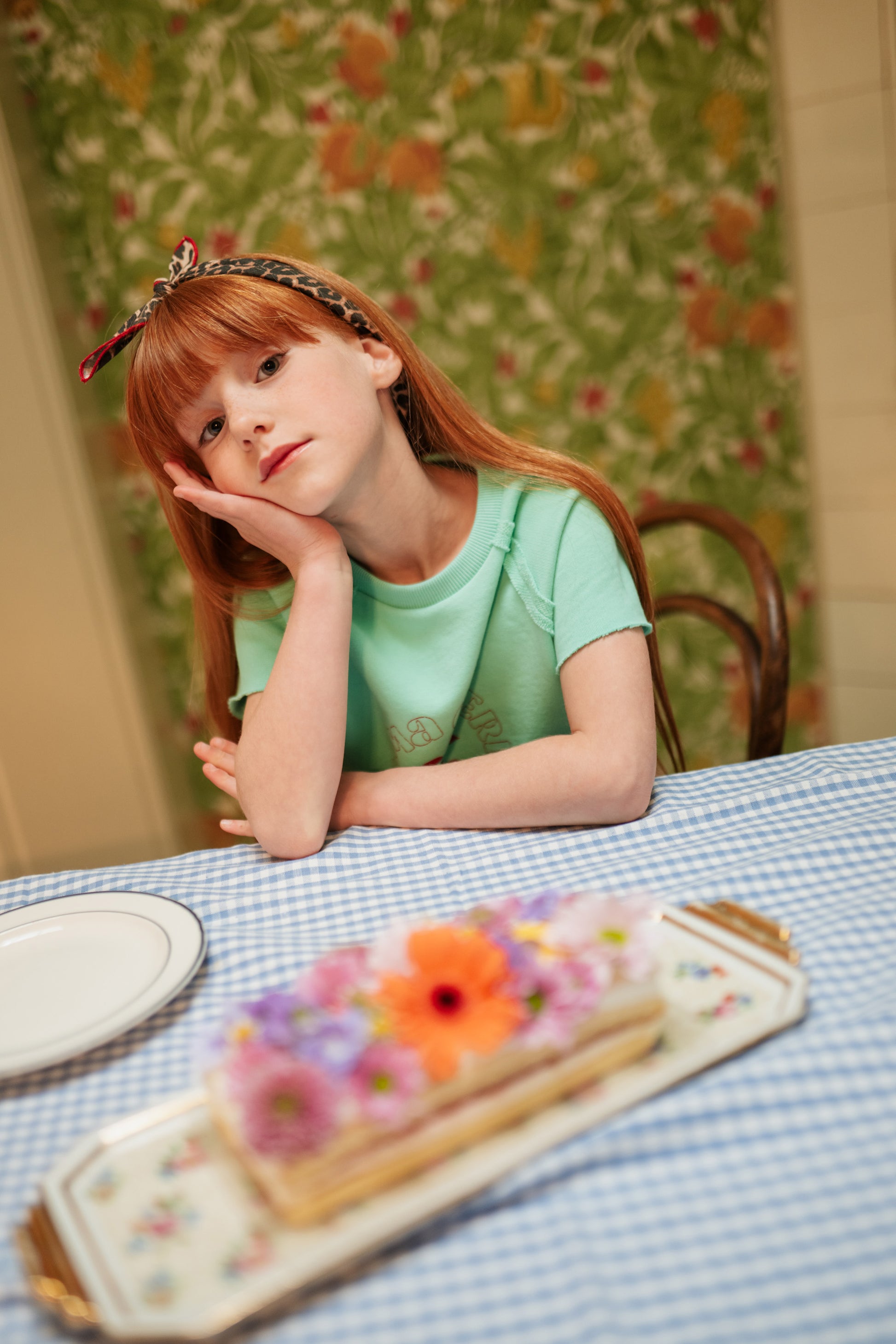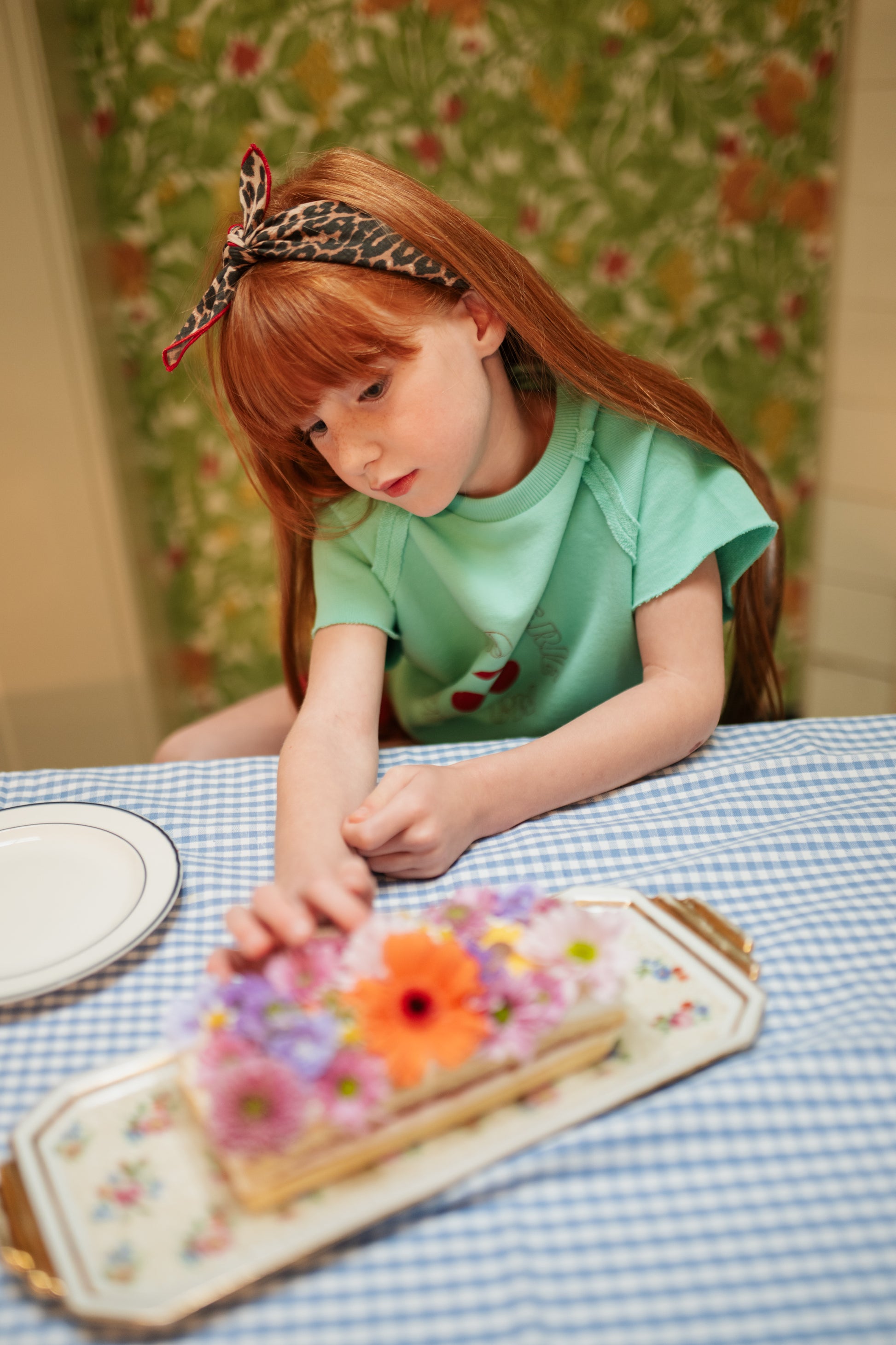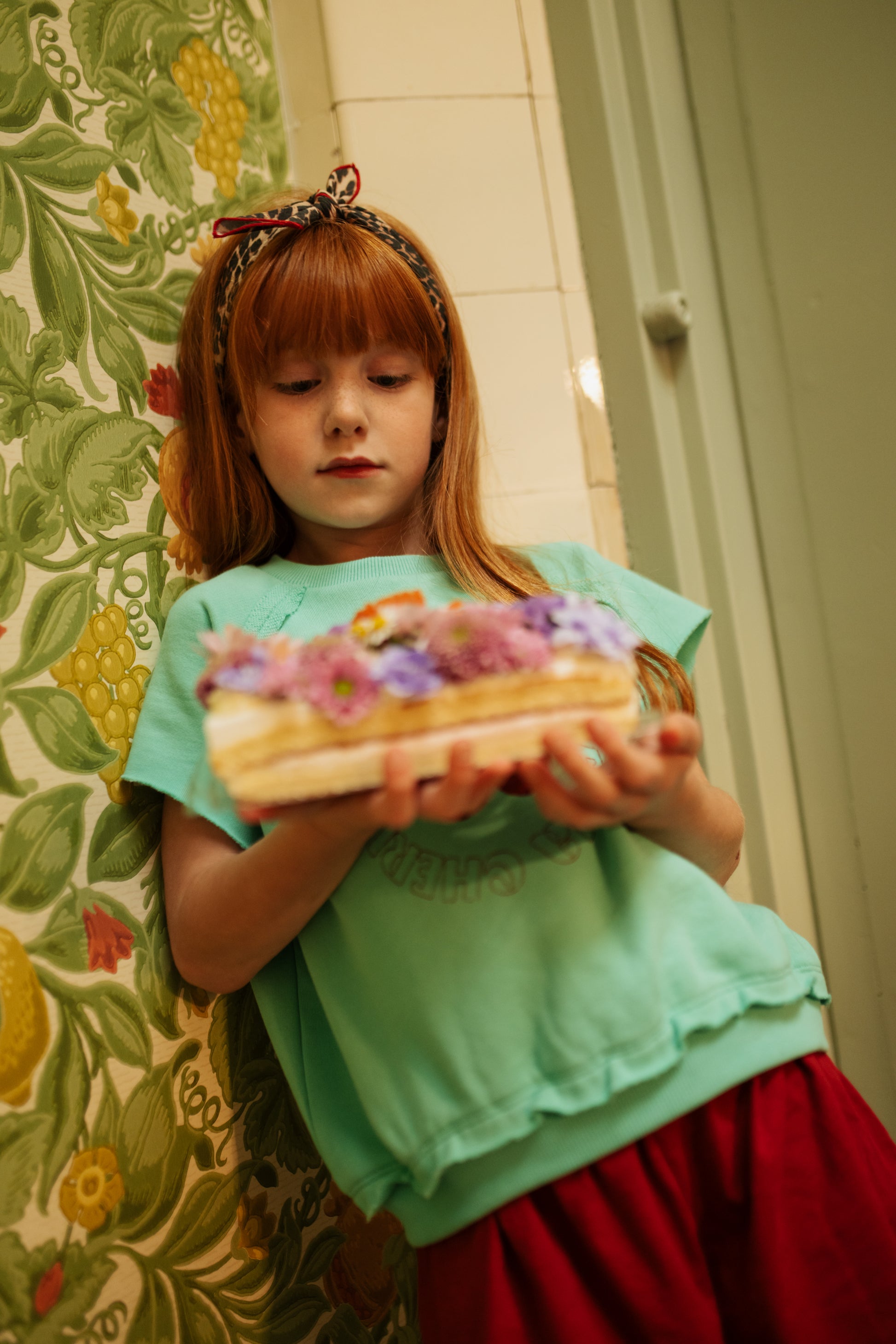 De relaxed, boxy fit met kapmouwtjes en rib boord langs de hals zorgt voor een comfy, effortless look. Onderaan geeft een subtiel raw-edge ruffle randje een speelse touch.